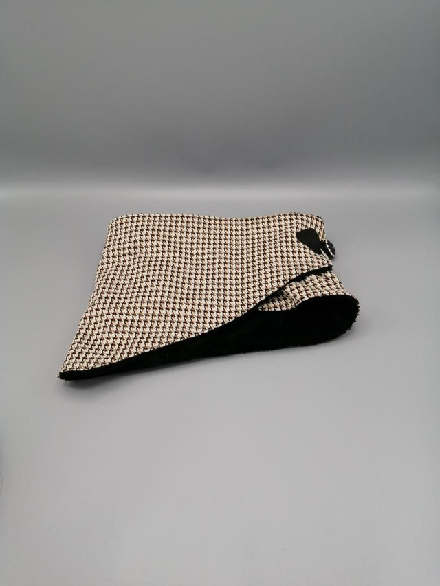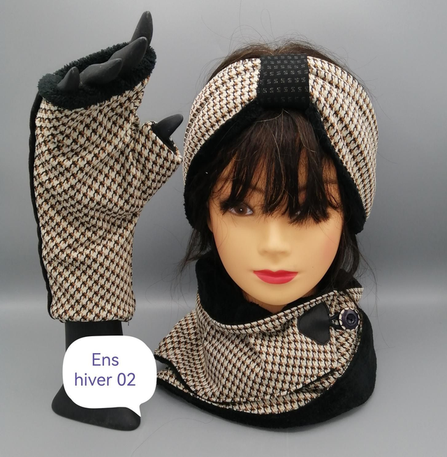 Cache oreilles, mitaine, tour de cou taillé en pointe fermé par bouton décoratif, maille extensible doublée polaire doudou donnant un toucher tres doux et chaud