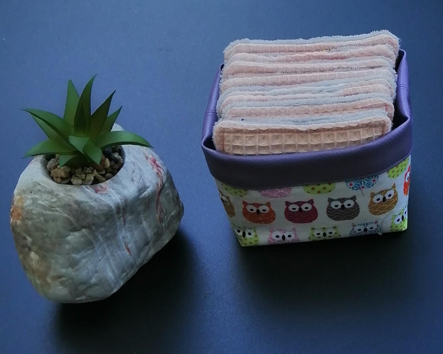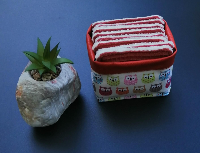 Pochon "chouette", doublé simili, avec 8 lingettes triple épaisseur, double face :