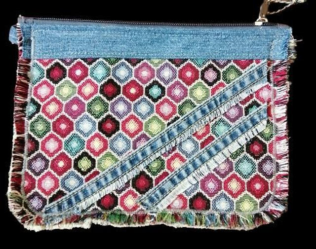pochette textile et jeans, doublée, zippée, poche intérieure , possibilité adapter bandoulière